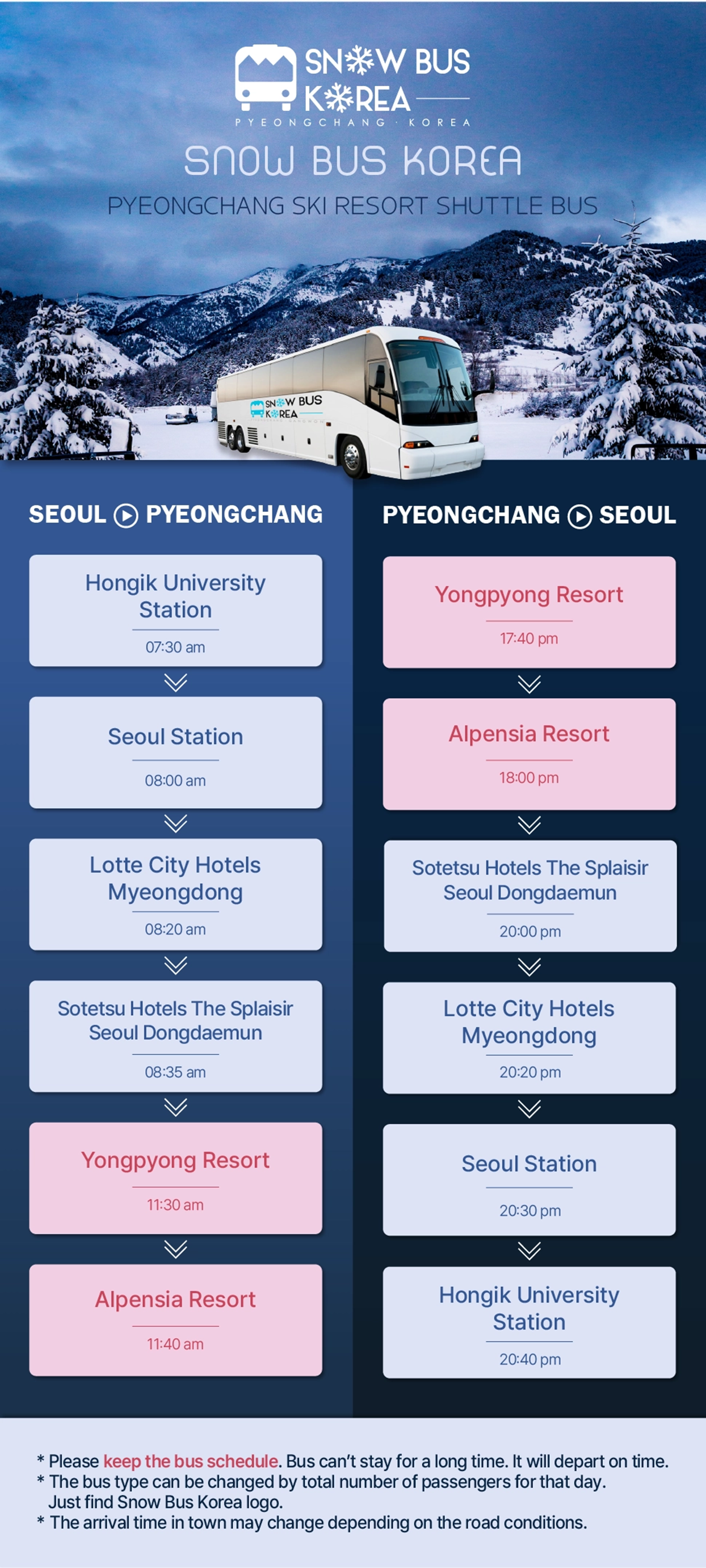 Additionally, when returning from Yongpyong, passengers can drop off at the same four locations in Seoul.